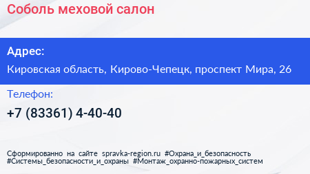 Соболь, меховой салон по адресу Кировская область, Кирово-Чепецк, проспект Мира, 26 в дальнейшем Организация, размещена в следующих категориях: