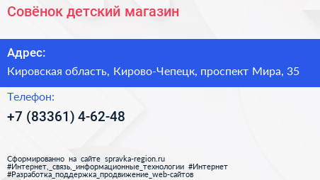 Совёнок, детский магазин по адресу Кировская область, Кирово-Чепецк, проспект Мира, 35 в дальнейшем Организация, размещена в следующих категориях: