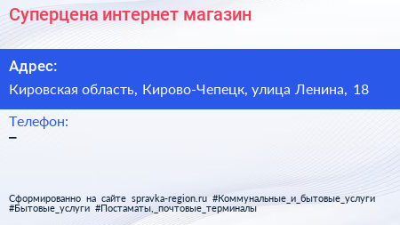 Суперцена, интернет-магазин по адресу Кировская область, Кирово-Чепецк, улица Ленина, 18 в дальнейшем Организация, размещена в следующих категориях: