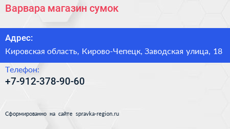 Варвара, магазин сумок по адресу Кировская область, Кирово-Чепецк, Заводская улица, 18 в дальнейшем Организация, размещена в следующих категориях: