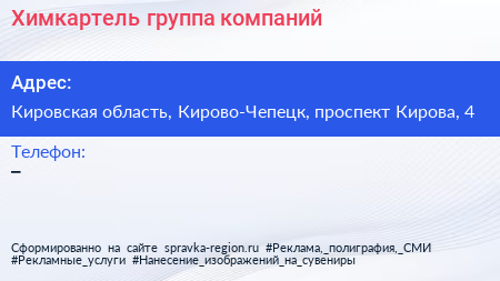 Химкартель, группа компаний по адресу Кировская область, Кирово-Чепецк, проспект Кирова, 4 в дальнейшем Организация, размещена в следующих категориях: