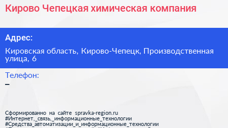 Кирово-Чепецкая химическая компания по адресу Кировская область, Кирово-Чепецк, Производственная улица, 6 в дальнейшем Организация, размещена в следующих категориях:
