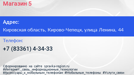 Магазин №5 по адресу Кировская область, Кирово-Чепецк, улица Ленина, 44 в дальнейшем Организация, размещена в следующих категориях: