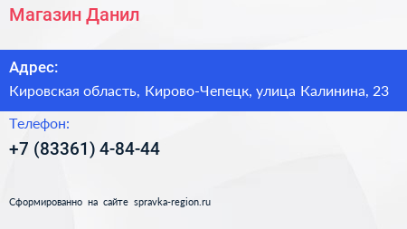 Магазин Данил по адресу Кировская область, Кирово-Чепецк, улица Калинина, 23 в дальнейшем Организация, размещена в следующих категориях:
