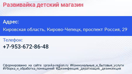 Развивайка, детский магазин по адресу Кировская область, Кирово-Чепецк, проспект Россия, 29 в дальнейшем Организация, размещена в следующих категориях: