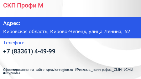 СКП-Профи М по адресу Кировская область, Кирово-Чепецк, улица Ленина, 62 в дальнейшем Организация, размещена в следующих категориях: