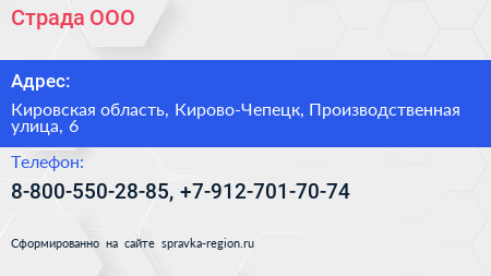 Страда, ООО по адресу Кировская область, Кирово-Чепецк, Производственная улица, 6 в дальнейшем Организация, размещена в следующих категориях: