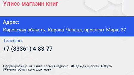 Улисс, магазин книг по адресу Кировская область, Кирово-Чепецк, проспект Мира, 27 в дальнейшем Организация, размещена в следующих категориях: