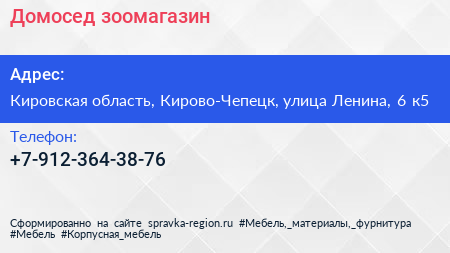 Домосед, зоомагазин по адресу Кировская область, Кирово-Чепецк, улица Ленина, 6 к5 в дальнейшем Организация, размещена в следующих категориях: