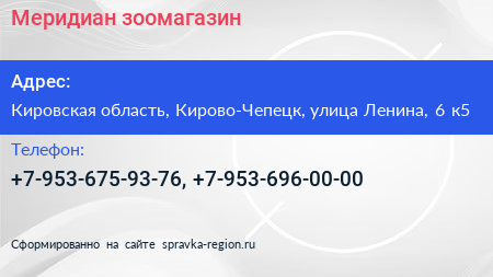 Меридиан, зоомагазин по адресу Кировская область, Кирово-Чепецк, улица Ленина, 6 к5 в дальнейшем Организация, размещена в следующих категориях: