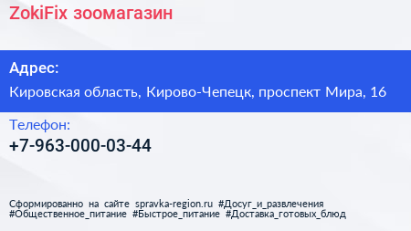 ZokiFix, зоомагазин по адресу Кировская область, Кирово-Чепецк, проспект Мира, 16 в дальнейшем Организация, размещена в следующих категориях: