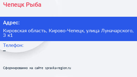 Чепецк Рыба по адресу Кировская область, Кирово-Чепецк, улица Луначарского, 3 к1 в дальнейшем Организация, размещена в следующих категориях: