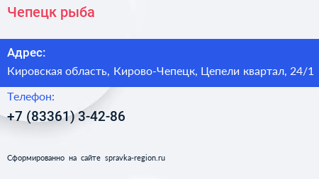 Чепецк-рыба по адресу Кировская область, Кирово-Чепецк, Цепели квартал, 24/1 в дальнейшем Организация, размещена в следующих категориях:
