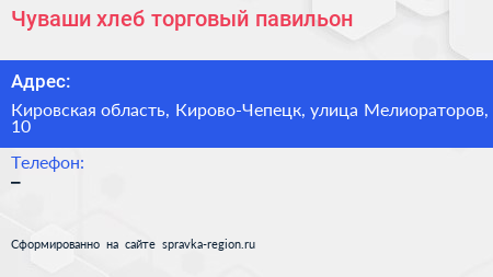 Чуваши-хлеб, торговый павильон по адресу Кировская область, Кирово-Чепецк, улица Мелиораторов, 10 в дальнейшем Организация, размещена в следующих категориях: