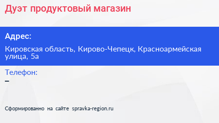 Дуэт, продуктовый магазин по адресу Кировская область, Кирово-Чепецк, Красноармейская улица, 5а в дальнейшем Организация, размещена в следующих категориях:
