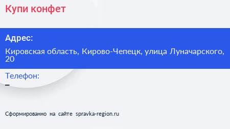 Купи конфет по адресу Кировская область, Кирово-Чепецк, улица Луначарского, 20 в дальнейшем Организация, размещена в следующих категориях: