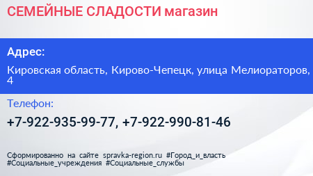 СЕМЕЙНЫЕ СЛАДОСТИ, магазин по адресу Кировская область, Кирово-Чепецк, улица Мелиораторов, 4 в дальнейшем Организация, размещена в следующих категориях: