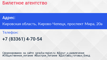 Билетное агентство по адресу Кировская область, Кирово-Чепецк, проспект Мира, 20а в дальнейшем Организация, размещена в следующих категориях: