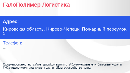 ГалоПолимер Логистика по адресу Кировская область, Кирово-Чепецк, Пожарный переулок, 5 в дальнейшем Организация, размещена в следующих категориях: