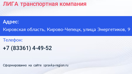 ЛИГА, транспортная компания по адресу Кировская область, Кирово-Чепецк, улица Энергетиков, 9 в дальнейшем Организация, размещена в следующих категориях: