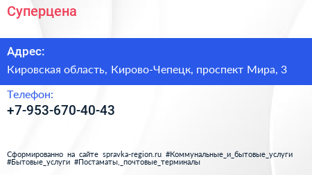 Суперцена по адресу Кировская область, Кирово-Чепецк, проспект Мира, 3 в дальнейшем Организация, размещена в следующих категориях: