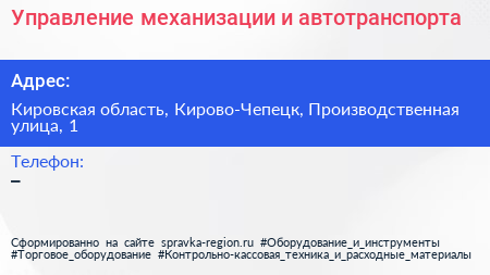 Управление механизации и автотранспорта по адресу Кировская область, Кирово-Чепецк, Производственная улица, 1 в дальнейшем Организация, размещена в следующих категориях: