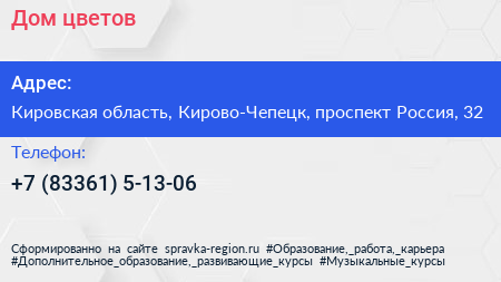 Дом цветов по адресу Кировская область, Кирово-Чепецк, проспект Россия, 32 в дальнейшем Организация, размещена в следующих категориях: