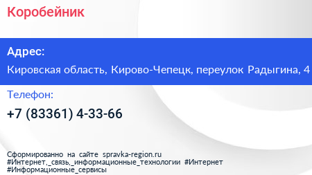 Коробейник по адресу Кировская область, Кирово-Чепецк, переулок Радыгина, 4 в дальнейшем Организация, размещена в следующих категориях: