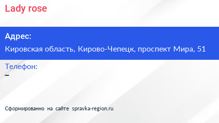 Lady rose по адресу Кировская область, Кирово-Чепецк, проспект Мира, 51 в дальнейшем Организация, размещена в следующих категориях: