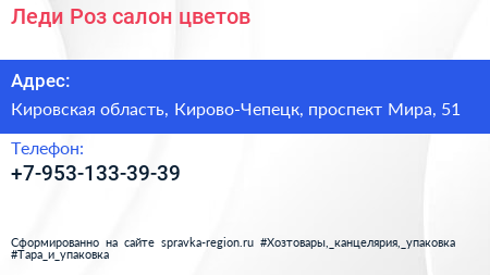 Леди Роз, салон цветов по адресу Кировская область, Кирово-Чепецк, проспект Мира, 51 в дальнейшем Организация, размещена в следующих категориях: