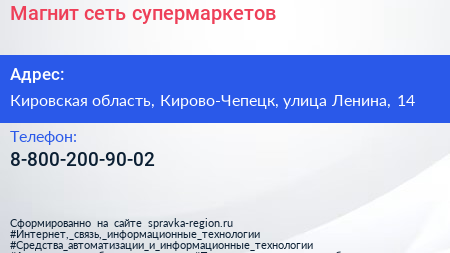 Магнит, сеть супермаркетов по адресу Кировская область, Кирово-Чепецк, улица Ленина, 14 в дальнейшем Организация, размещена в следующих категориях: