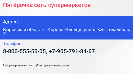 Пятёрочка, сеть супермаркетов по адресу Кировская область, Кирово-Чепецк, улица Фестивальная, 7 в дальнейшем Организация, размещена в следующих категориях: