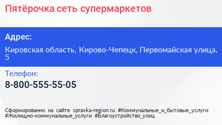 Пятёрочка, сеть супермаркетов по адресу Кировская область, Кирово-Чепецк, Первомайская улица, 5 в дальнейшем Организация, размещена в следующих категориях: