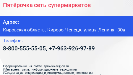 Пятёрочка, сеть супермаркетов по адресу Кировская область, Кирово-Чепецк, улица Ленина, 30а в дальнейшем Организация, размещена в следующих категориях: