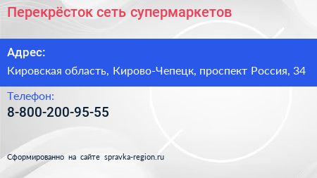 Перекрёсток, сеть супермаркетов по адресу Кировская область, Кирово-Чепецк, проспект Россия, 34 в дальнейшем Организация, размещена в следующих категориях: