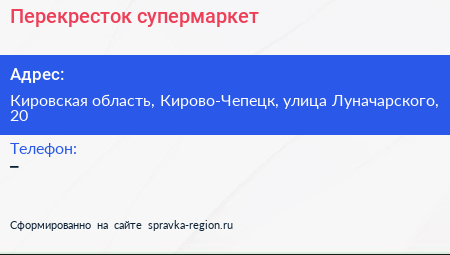 Перекресток, супермаркет по адресу Кировская область, Кирово-Чепецк, улица Луначарского, 20 в дальнейшем Организация, размещена в следующих категориях: