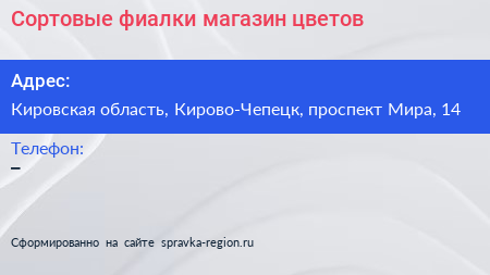 Сортовые фиалки, магазин цветов по адресу Кировская область, Кирово-Чепецк, проспект Мира, 14 в дальнейшем Организация, размещена в следующих категориях: