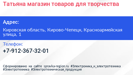 Татьяна, магазин товаров для творчества по адресу Кировская область, Кирово-Чепецк, Красноармейская улица, 1 в дальнейшем Организация, размещена в следующих категориях:
