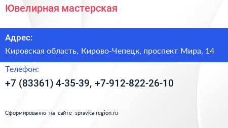 Ювелирная мастерская по адресу Кировская область, Кирово-Чепецк, проспект Мира, 14 в дальнейшем Организация, размещена в следующих категориях:
