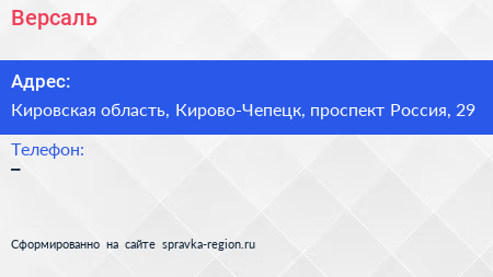 Версаль по адресу Кировская область, Кирово-Чепецк, проспект Россия, 29 в дальнейшем Организация, размещена в следующих категориях: