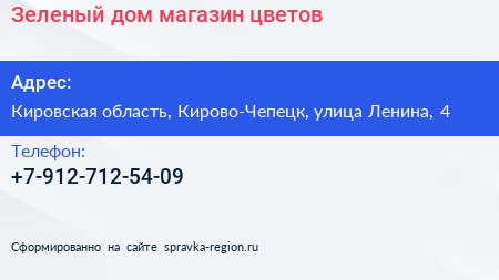 Зеленый дом, магазин цветов по адресу Кировская область, Кирово-Чепецк, улица Ленина, 4 в дальнейшем Организация, размещена в следующих категориях: