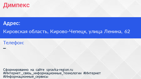 Димпекс по адресу Кировская область, Кирово-Чепецк, улица Ленина, 62 в дальнейшем Организация, размещена в следующих категориях: