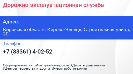 Дорожно-эксплуатационная служба по адресу Кировская область, Кирово-Чепецк, Строительная улица, 2Б в дальнейшем Организация, размещена в следующих категориях: