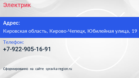 Электрик по адресу Кировская область, Кирово-Чепецк, Юбилейная улица, 19 в дальнейшем Организация, размещена в следующих категориях: