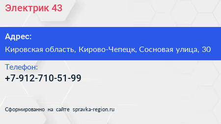 Электрик 43 по адресу Кировская область, Кирово-Чепецк, Сосновая улица, 30 в дальнейшем Организация, размещена в следующих категориях: