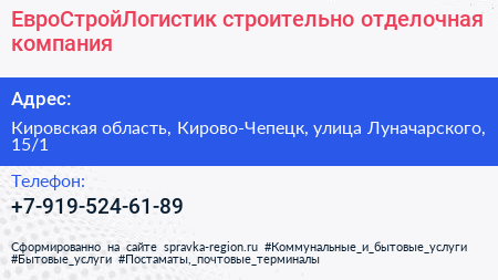 ЕвроСтройЛогистик, строительно-отделочная компания по адресу Кировская область, Кирово-Чепецк, улица Луначарского, 15/1 в дальнейшем Организация, размещена в следующих категориях: