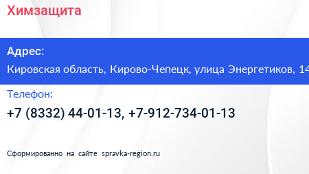 Химзащита по адресу Кировская область, Кирово-Чепецк, улица Энергетиков, 14 в дальнейшем Организация, размещена в следующих категориях: