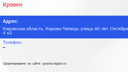 Кровен по адресу Кировская область, Кирово-Чепецк, улица 60 лет Октября, 4 к2 в дальнейшем Организация, размещена в следующих категориях: