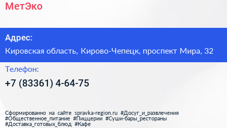 МетЭко по адресу Кировская область, Кирово-Чепецк, проспект Мира, 32 в дальнейшем Организация, размещена в следующих категориях: