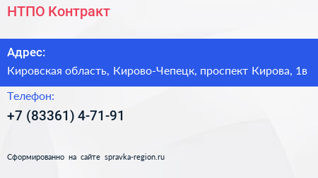 НТПО Контракт по адресу Кировская область, Кирово-Чепецк, проспект Кирова, 1в в дальнейшем Организация, размещена в следующих категориях: